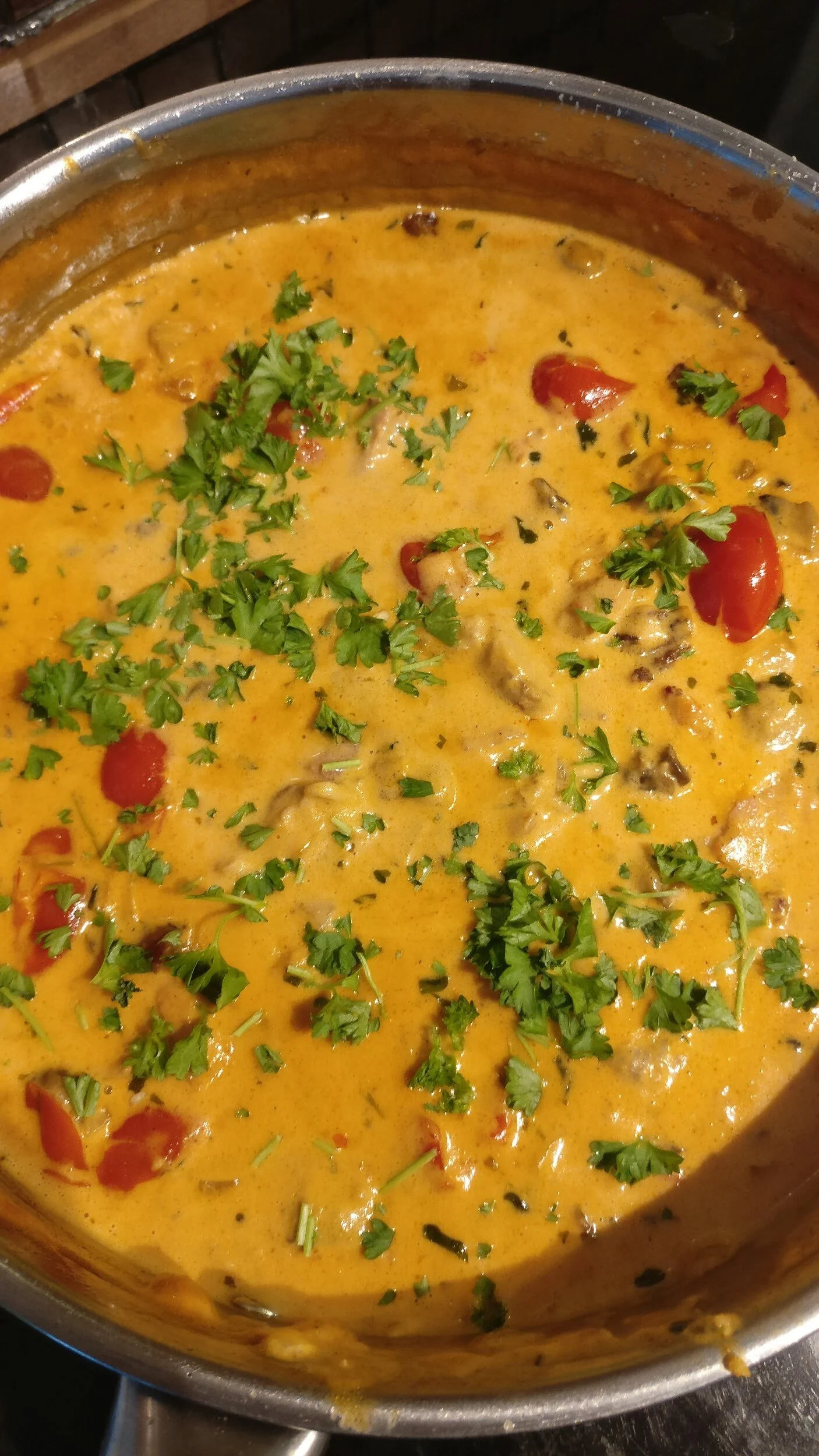 Tillsätt persilja, tomater och häll sedan i grädden. Låt puttra i nån minut. Tillsätt tomatpuré och rör om. Häll lite pastavatten. Låt puttra på svag värme i ca 5 minuter tills såsen är krämig.